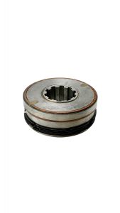 При подаче напряжения на катушку якорь притягивается к корпусу и сжимает пакет фрикционных дисков, вследствие чего момент передается с ведущего вала на ведомый.