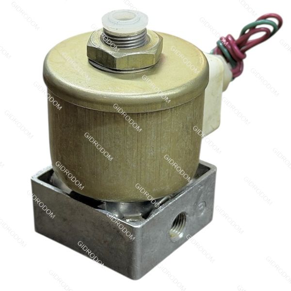 При подаче напряжения на электромагнит якорь, преодолевая силу пружины, смещается к упору, перекрывая выход в атмосферу и открывая канал, соединенный с отверстием подвода подачи воздуха. Воздух поступает в канал потребителя.
