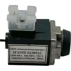 Электромагнит ПЭ-35 предназначен для дистанционного управления гидрораспределителями с условным проходом Ду 6 мм, такими как ВЕ6, 1РЕ6, МРЭ6, ПЕ6 и другими. Для мобильной техники рекомендуется использовать электромагнит ПЭ36. Этот электромагнит является полным аналогом КВМ35 и ЭМ24. Катушка изолирована стеклонаполненным полиамидом, а металлические элементы, контактирующие с внешней средой, защищены от коррозии. Электромагнит имеет ряд характеристик: он изготовлен с «мокрым якорем», оснащен кнопкой ручного включения, рабочее давление жидкости в его полости составляет 6 МПа, а степень защиты при подключении с использованием различных соединителей составляет IP54 или IP65 в зависимости от типа соединителя. Производство электромагнитного привода ПЭ35 с электрическим соединителем 2РМГ прекращено, для аналогичных разъемов рекомендуется применять привод типа ПЭ36.