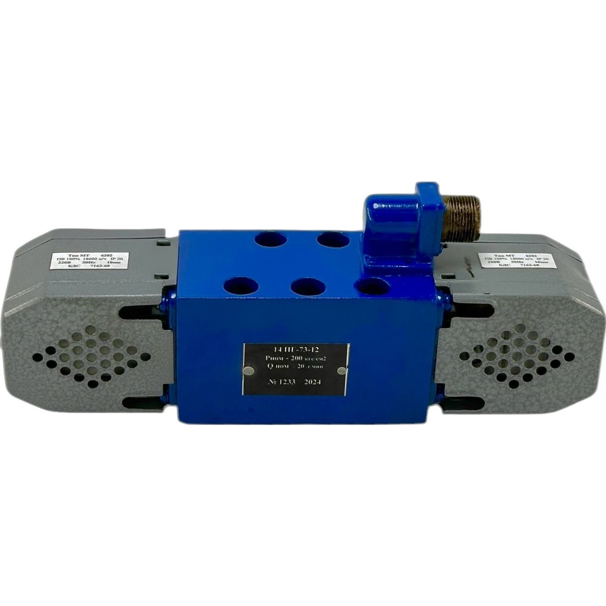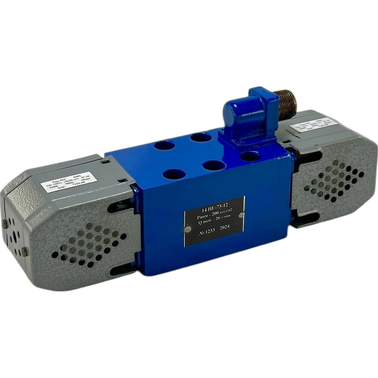 В распределителях 44ПГ73-12 и 45ПГ73-12 управление золотником осуществляется через два электромагнита и пружины, которые центрируют золотник при отключении питания. Для станочного оборудования используются электромагниты на 220В / 110В переменного тока, а для мобильной техники — на 12В / 24В постоянного тока. Газировка напряжения также указывается в конце маркировки: 44ПГ73-12 В220 (допускается 44ПГ73-12.220).