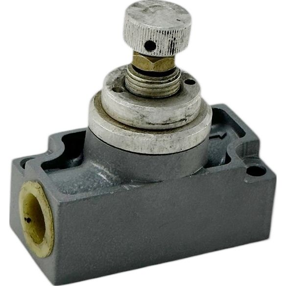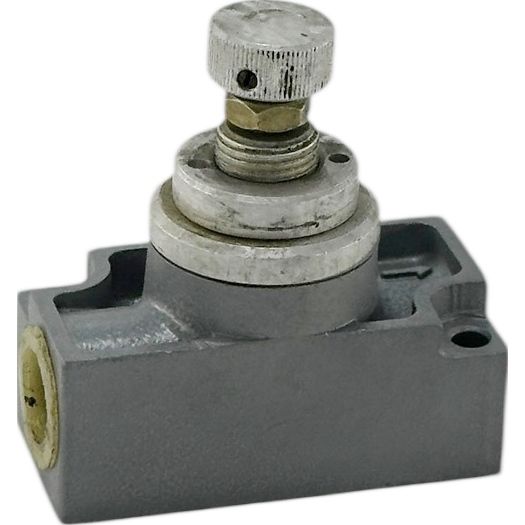 Настройка дросселя П-ДК под требуемый расход сжатого воздуха осуществляется поворотом регулировочной ручки, фиксирующейся гайкой. При изменении направления движения потока сжатого воздуха резиновая пневматическая манжета отделяется от посадочного седла в корпусе, что обеспечивает свободный проход воздуха в обратном направлении.